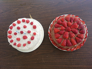 Chocolate strawberry cake was this frosting (used semisweet chocolate chips) and some random chocolate dump cake recipe. I frosted the bottom layer then added a couple cups of strawberries, lightly mashing about half of them and adding the rest chopped. I frosted the bottom of the second layer before putting it on to keep the cake from soaking up strawberry juice. After frosting the cake, I decorated with some more sliced strawberries. It worked well. The strawberries were sweet enough without any added sugar and the frosting also wasn't over sweet.
